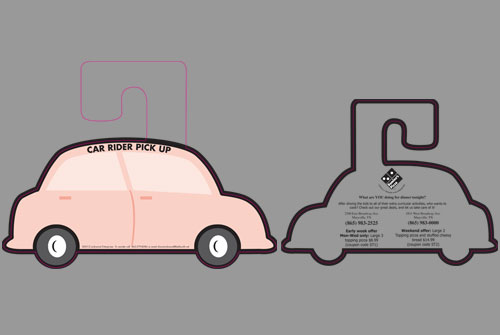 Our car tags are also FREE to your school. It is a great design, shaped like a car, and hangs on the rearview mirror. They are laminated, and very durable. We can customize the front with the school name, and change the color of the car. We highly recommend changing the car color yearly, as family situations change, and the people that were approved to pick up a child last year, may not be on the approved list to pick them up the following year. To get them free, we put a family friendly sponsor on the back of the tag. We have had schools opt to purchase them sponsor free, and insert their car rider policy on the back. Talk to us about what you are interested in. We can offer the tags at an affordable rate, or with a sponsor, they are completely FREE!